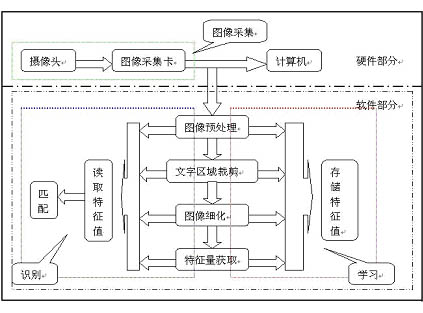 “Process”可以使用户能够在对自动处理的图像不满意的情况下完成手动图像处理,通过扩展该功能可以更加完善系统,提高系统在不同环境下的适应能力;主程序一共具有三个图像显示器,左上方的图像显示器显示的是采集得到的图像或使用“Open”打开的图像,“Open”和“Save”两个按钮对这个图像显示器中的图像进行操作的;左下方的图像显示器显示的是经过图像处理之后的图像,方便用户与原图像进行比较,“Save Image”对这个图像显示器中的图像操作;右侧的小型图像显示器显示的是细化后的单个文字的图像,使得用户可以实时观察细化效果。 在使用识别系统之前,用户需要完成以下几个工作。 1. 启动采集设备,如图像采集卡、摄像头、光源等; 2. 调整好摄像头焦距及位置等,调整光源方向,使得采集具有环境,从而提高系统的识别率。外界环境对于识别率具有举足轻重的作用,一个优良的环境能够大幅提高系统的识别率。 3. 配置好NI的图像采集设备。